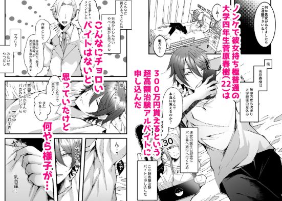 大学四年生のノンケの男子大学生、菅原春樹は学生最後の夏、彼女の誕生日祝いと思い出作りの旅行のバリ島に行くために報酬300万円の高額治験アルバイトへ申し込む